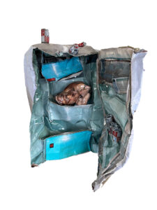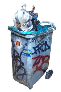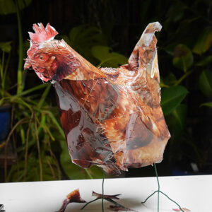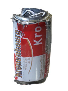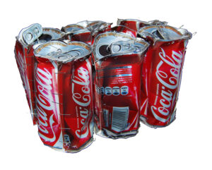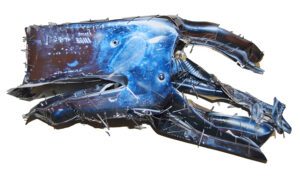 For two decades, Cyril Hatt has been creating a series of works focusing on everyday life, whether objects or animals: from musical instruments (guitar, trumpet, etc.), to the very trivial beer can and ashtray, including giraffes, pigeons, and baby elephants. When it comes to consumer products, the work of deconstruction/reconstruction generated by the artist’s photographic prism and the sculptural distortion via stapling are rooted above all in a denunciation of the consumerism specific to the counterculture to which he belongs.